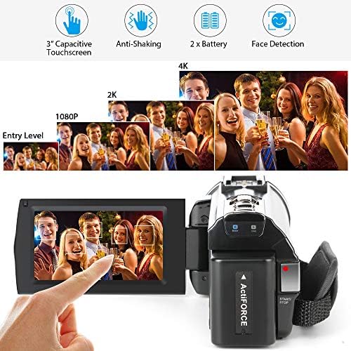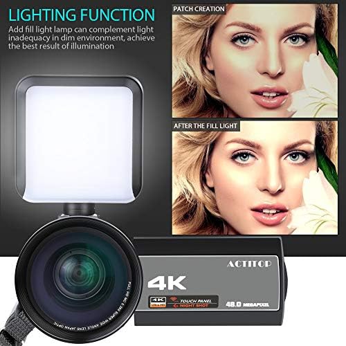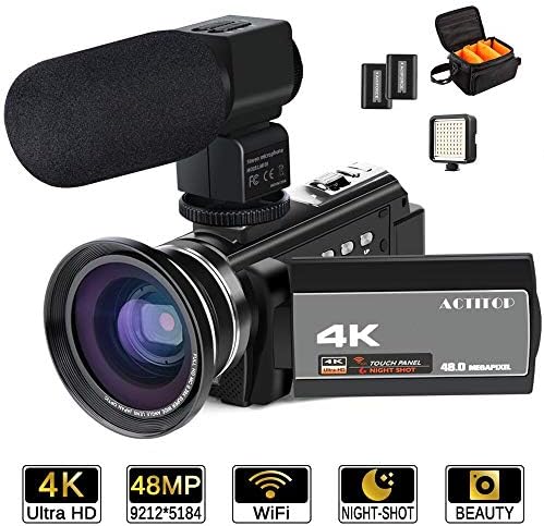 Videocamera 4K, ACTITOP 48MP full hd 1080p wifi IR Night Vision Videocamera con zoom digitale 16X con microfono esterno, obiettivo grandangolare, luce video a LED e borsa per fotocamera