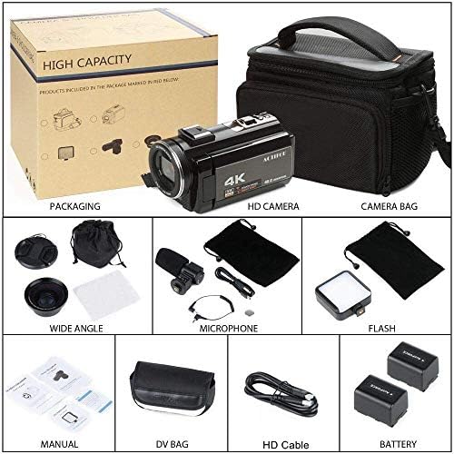 【Cosa ottieni】 Fotocamera 1 * 4K, 2 * Batterie ricaricabili agli ioni di litio, 1 * Microfono esterno, 1 * Luce LED, 1 * Obiettivo macro, 1 * Obiettivo grandangolare, 1 * Adattatore grandangolare, 1 * Batteria batteria , 1 * Cavo HD, 1 * Cavo di ricarica, 1 * Borsa da viaggio per videocamera, 3 * Manuale dell'utente; Servizio clienti cordiale 24 ore